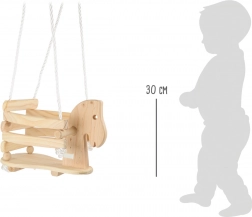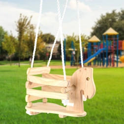 Drvena ljuljačka u obliku konjića izvrstan je izbor za prvo ljuljanje. Precizno obrađeno masivno drvo u prirodnoj izvedbi je izdržljivo i ujedno spremno za eventualno kreativno bojanje prema vašoj mašti. Povišena prečka, naslon za leđa i bočne ručke pružaju maksimalnu stabilnost i sigurnost i najmlađim jahačima.