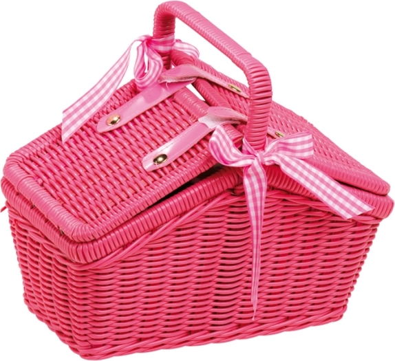 Ova ružičasta piknik košara idealan je pratitelj za izlete s lutkama i dječje čajne zabave. Moderan dizajn u stilu 70-ih u kombinaciji s metalnim posuđem s cvjetnim uzorkom razveselit će male domaćice i domaćine. Košara od umjetnog pletiva dovoljno je prostrana za cijeli set posuđa i male poslastice.