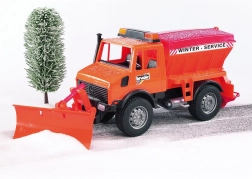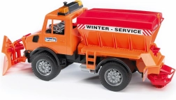 Mercedes-Benz Unimog marke BRUDER je robustan posipač s ralicom namijenjen zimskim poslovima. Zahvaljujući preciznoj izradi djeci pruža realističnu igru – od čišćenja snijega do posipanja kolnika. Prednja zglobna os osigurava izvrsnu upravljivost, a ralica je ne samo okretljiva nego i lako odvojiva.