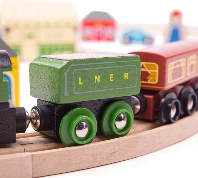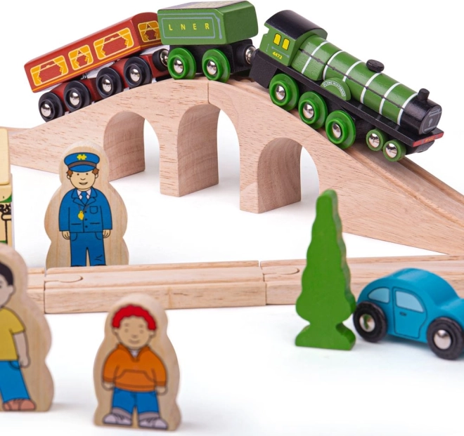 Flying Scotsman spada među najpoznatije vlakove svoje ere, a uz ovu drvenu željezničku prugu djeca mogu ponovno proživjeti njegova slavna putovanja. Set sadrži lijepo izrađen vlak koji će vas povesti na nostalgičnu vožnju punu vijadukata i prirodnih krajolika. U kompletu su i retro kolodvor, kuće i automobili uz prugu.