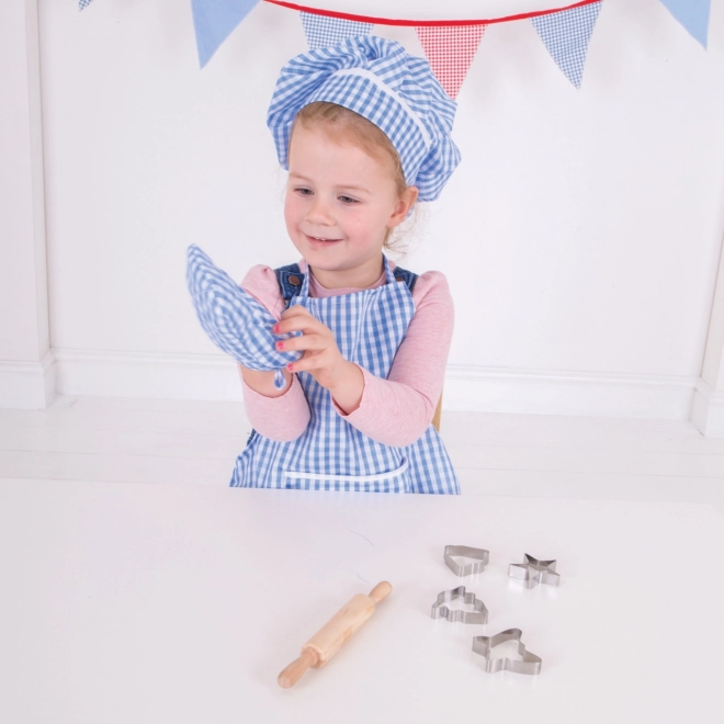 Mali kuhari će obožavati ovaj svijetli i ugodni plavi pamučni set za pečenje i kuhanje. Sadrži pregaču, rukavicu, kuharsku kapu, valjak i kalupe, idealno za zabavno kuhanje i igre uloga.