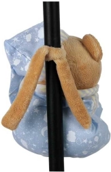 Medvjedić ima plavu pidžamu s uzorkom zvjezdica i mjeseca, što stvara umirujući dojam i predstavlja idealnog saputnika za dječju sobu.