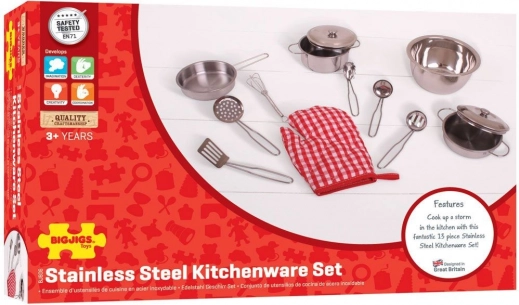 Profesionalno izgledajući dječji set kuhinjskog posuđa od metala razveselit će male kuhare i potaknuti njihovu maštu. Sadrži 13 dijelova uključujući praktičnu rukavicu, zadovoljava europske sigurnosne norme i idealan je za igru kuhanja. Izdržljiv metal, razvoj kreativnosti i fine motorike, sjajna igra uloga.