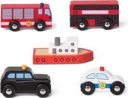 Vatrogasni kamion, policijski auto, dvospratni autobus, crni taksi i brod – sve spremno za dinamičnu igru u gradu.