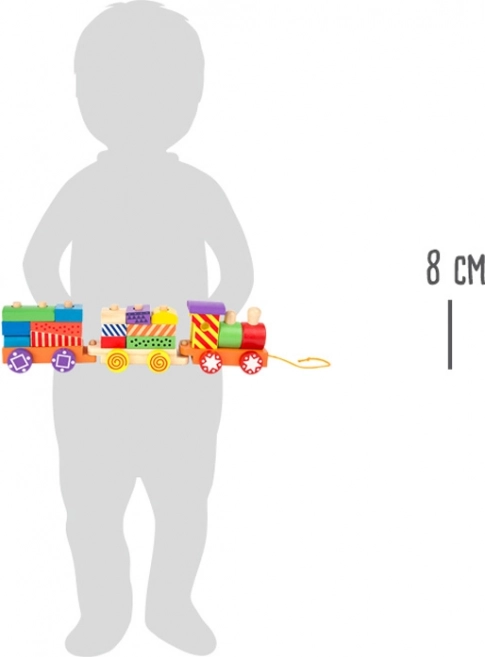 Zabavni vlak na povlačenje za najmlađe razvija motoriku, koordinaciju i maštu. Zahvaljujući šarenim drvenim blokovima moguće je lako mijenjati izgled lokomotive i dva vagona, koje se može spojiti i vući uzicom. Vesele boje i uzorci potiču na igru i učenje.