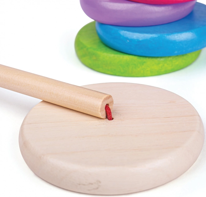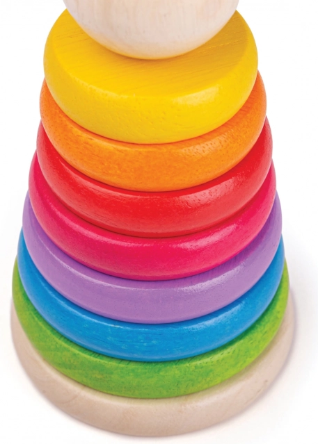 Ovaj drveni stogasti pajac idealna je igračka za razvoj fine motorike te koordinacije ruku i očiju. Slaganje prstenova po veličini ne samo da zabavlja, već i uči djecu razlikovati veličine i boje.