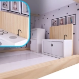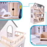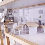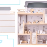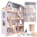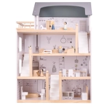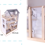 Kuća ima čak četiri kata i nudi mnogo prostora za igru! Drvena terasa na gornjoj etaži daje čitavoj kući poseban šarm. Među brojnim različitim prostorijama nalaze se kupaonica, radna soba, dnevni boravak, blagovaonica s kuhinjskim kutkom i spavaća soba. Svaka od njih je potpuno opremljena i spremna primiti novu obitelj lutaka. Zahvaljujući velikim dimenzijama, unutra mogu stati ne samo najmanje lutke, pa se ne morate brinuti da bi omiljeni prijatelj vašeg djeteta propustio zabavu!