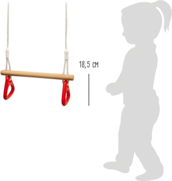 Drvena prečka s dvjema plastičnim ručkama omogućuje ljuljanje, sjedenje i izvođenje povlačenja. Idealno za jačanje gornjeg dijela tijela i razvoj koordinacije.