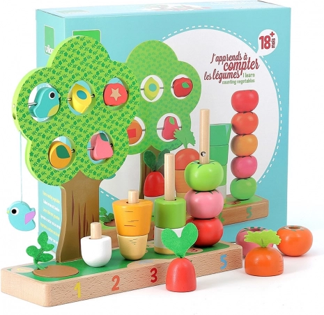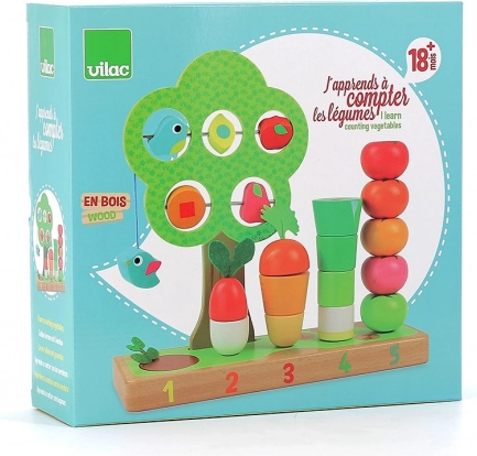 Otkrijte razigrani drveni set Vilac koji djeci pomaže naučiti brojiti, prepoznavati boje i oblike te istovremeno vježbati finu motoriku. Šareni dijelovi povrća i voća stavljaju se na numerirane klince, a kuglice se pomiču po stabalcu – sigurna i izdržljiva konstrukcija idealna je za djecu od 18 mjeseci.