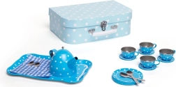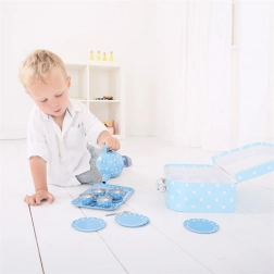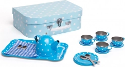 Preslatki čajni set s bijelim točkama smješten je u laganom kartonskom kovčegu pa ga djeca mogu ponijeti bilo kamo – na izlet, k baki i djedu ili na piknik. Metalni čajnik, šalice i tanjurići jamče izdržljivost, dok poslužavnik i žličice upotpunjuju realističan doživljaj igre.