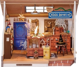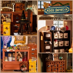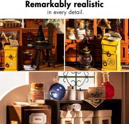 Drvene police, ladice i pult s napitcima, kristalima i šeširom vještice donose realističan izgled i radost otkrivanja svakog kutka.