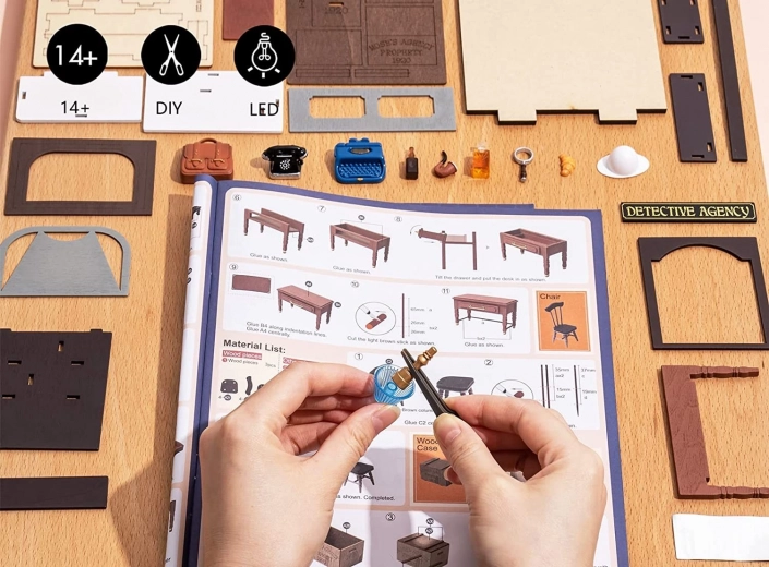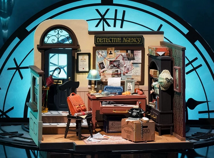 Otkrijte čar klasične detektivske priče s nostalgičnim elementima – od retro pisaćeg stroja preko rotary telefona do oglasne ploče s tragovima i ikoničnog detektivskog šešira. Svaki dio sastavit ćete vlastitim rukama, a zahvaljujući LED osvjetljenju gotov model stvara dojmljivu atmosferu i nakon sumraka.