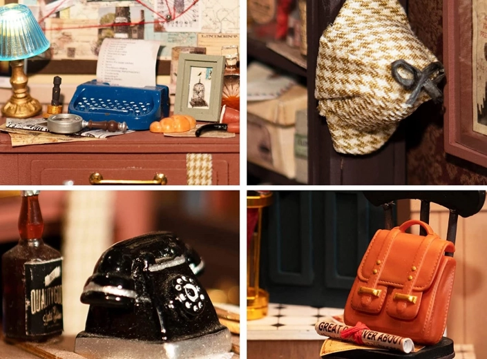 Pisaći stroj, oglasna ploča s tragovima, telefon i šešir – svaka minijatura stvara atmosferu britanske detektivske agencije.
