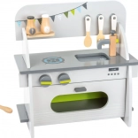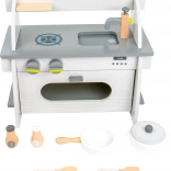 Kompaktna dječja kuhinjica od FSC certificiranog drva donosi sve za realističnu igru kuhanja: pećnicu s magnetnim vratima, okretne gumbe s klikom i bogatu opremu uključujući lonac s poklopcem, soljenku i paprenku. Zahvaljujući pametnoj konstrukciji sastavlja se i rastavlja bez upotrebe alata.