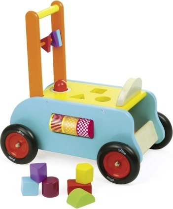 Sa strane se nalaze otvori za umetanje drvenih oblika, na lijevoj strani rotirajući šareni valjci, a ispod naslona šareni rotirajući trokutovi. Sjedeća površina opremljena je trubom sa zvučnim efektima koja djecu zabavlja i motivira na daljnja otkrića. Zbog niske visine sjedišta guralica je udobna i za manju djecu.