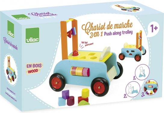 Stilska drvena guralica brenda VILAC spaja funkcije hodalice, odrážala i umetaljke. Zahvaljujući stabilnoj konstrukciji, velikim gumiranim kotačima i udobnom sjedalu s malim naslonom, idealna je za prve korake i vožnju. Šareni rotirajući elementi, umetanje oblika i truba s zvučnim efektima razvijaju motoriku, osjetilnu percepciju i prostornu maštu djece.