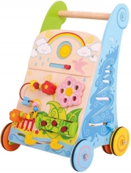 Robusna drvena konstrukcija, sigurna ručka i šareni kotačići potiču sigurno i samopouzdano kretanje mališana.