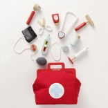 Stilisan doktorský set za male liječnike i liječnice u tekstilnoj torbi s drvenim ručkama donosi sve potrebno za igru ordinacije. Sadrži ukupno 10 dijelova uključujući stetoskop, toplomjer i štrcaljku. Igračka je rodno neutralna, potiče finu motoriku, maštu i kognitivne vještine. Izrađeno od održivog drva s FSC certifikatom i ručno dotjerano netoksičnim bojama na bazi vode.