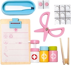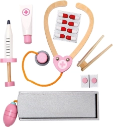 Set uključuje drvene alate poput stetoskopa, injekcijske štrcaljke i drugih pomagala koja podržavaju realističnu igru.
