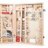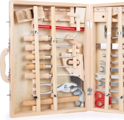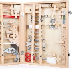 U kovčegu ćete pronaći sve što je potrebno za male kućne projekte i igre na obrtnike: ključeve, odvijače, pilu, škare, dlijeto, tesarsku olovku, šesterokutni ključ, čekić i dodatnu opremu. Set od 48 dijelova potiče finu motoriku, koncentraciju i kreativnost.