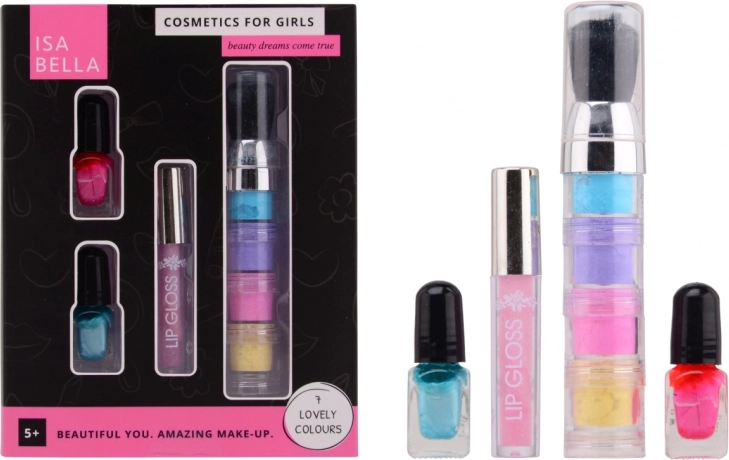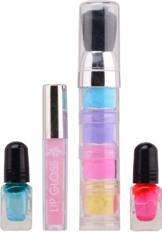 - Kompletna oprema: sjenila za oči, sjajilo za usne i 2× lak za nokte
