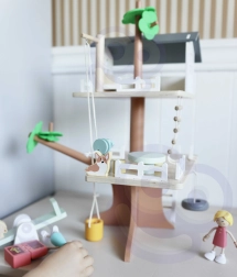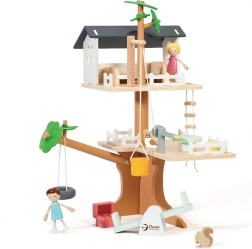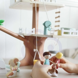Paket sadrži 31 element uključujući 2 dječje figurice, 2 životinjice i dodatke poput ljuljačke, ljuljačke–gume, balansne ljuljačke, kreveta, stola, stolica i škrinje s blagom. Pažljivo obrađeno prirodno drvo s nježnim bojama izdržljivo je i ugodno na dodir.