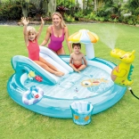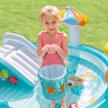 Ovaj bazen marke INTEX uključuje igračke elemente poput nafukave patkice i ribarskog kantuna, koji potiču zabavu i kreativnost djece dok se igraju u vodi. Također je dostupan i nafukavi volan, što daje djeci mogućnost igranja različitih igara.