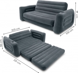 Ovaj inovativni komad namještaja marke Intex ističe se jednostavnim dizajnom i praktičnom upotrebom za kućanstvo ili odmor. S veličinom od 231x203x66 cm nudi ne samo prostor za udobno sjedenje, već zbog svoje konstrukcije i za spavanje u Queen formatu. Presvučen je mekanim baršunastim velurom koji osigurava udobnost.