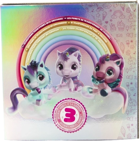 Interaktivni plišani poni koji će postati vaš najdraži prijatelj. Reagira na dodire i brigu s više od 30 zvukova i akcija – od radosnog rzanja do nježnog predenja. Zahvaljujući postupnoj preobrazbi u tri čarobne faze promatrat ćete kako mu raste šareni rog i kako se iz ponija pretvara u prekrasnog jednoroga.