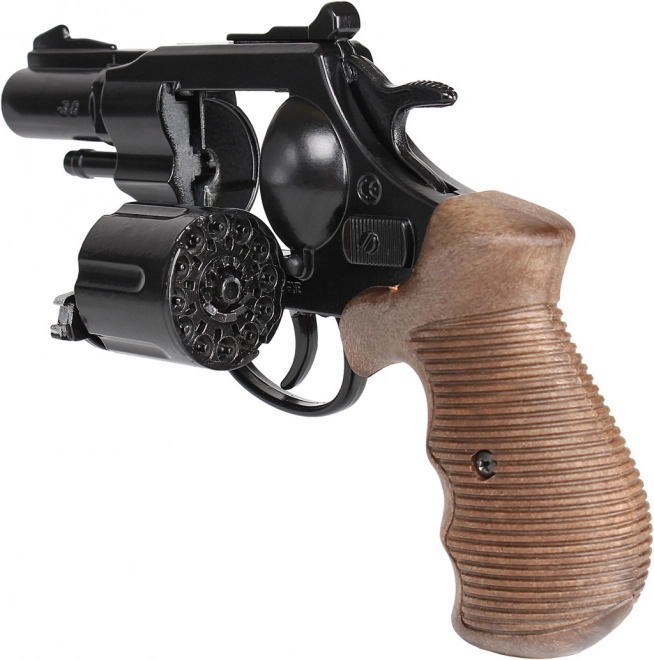 Otkrijte zabavu s policijskim revolverom iz edicije Gold Collection. Ovaj model u elegantnoj crnoj boji kombinira čvrsto metalno tijelo, udobnu dršku i realistične detalje uključujući okretni bubanj. Predviđen je za kapsule (12 hitaca) koje stvaraju autentičan zvučni efekt, uz očuvanje sigurnosti igre.