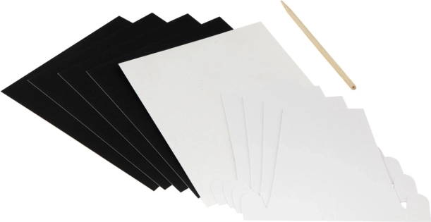 - 4 x papirna lista, 1 x olovka za grebanje, 1 x šablona, 4 x stalci