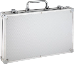 Ovaj metalni kovčeg opremljen je čvrstom ručkom i sigurnim kopčama, što omogućuje lako prenošenje i sigurnu organizaciju cjelokupnog pribora.