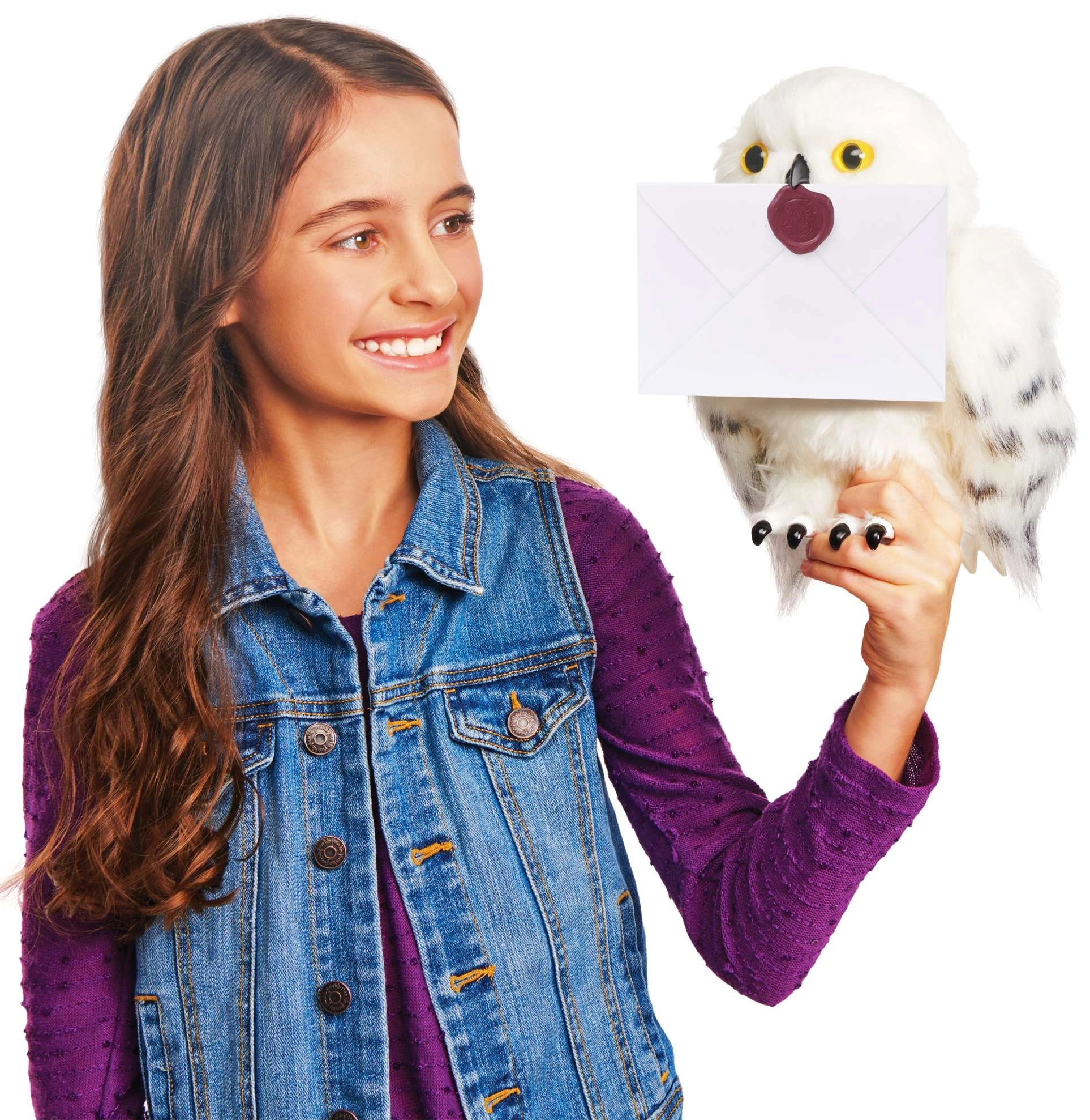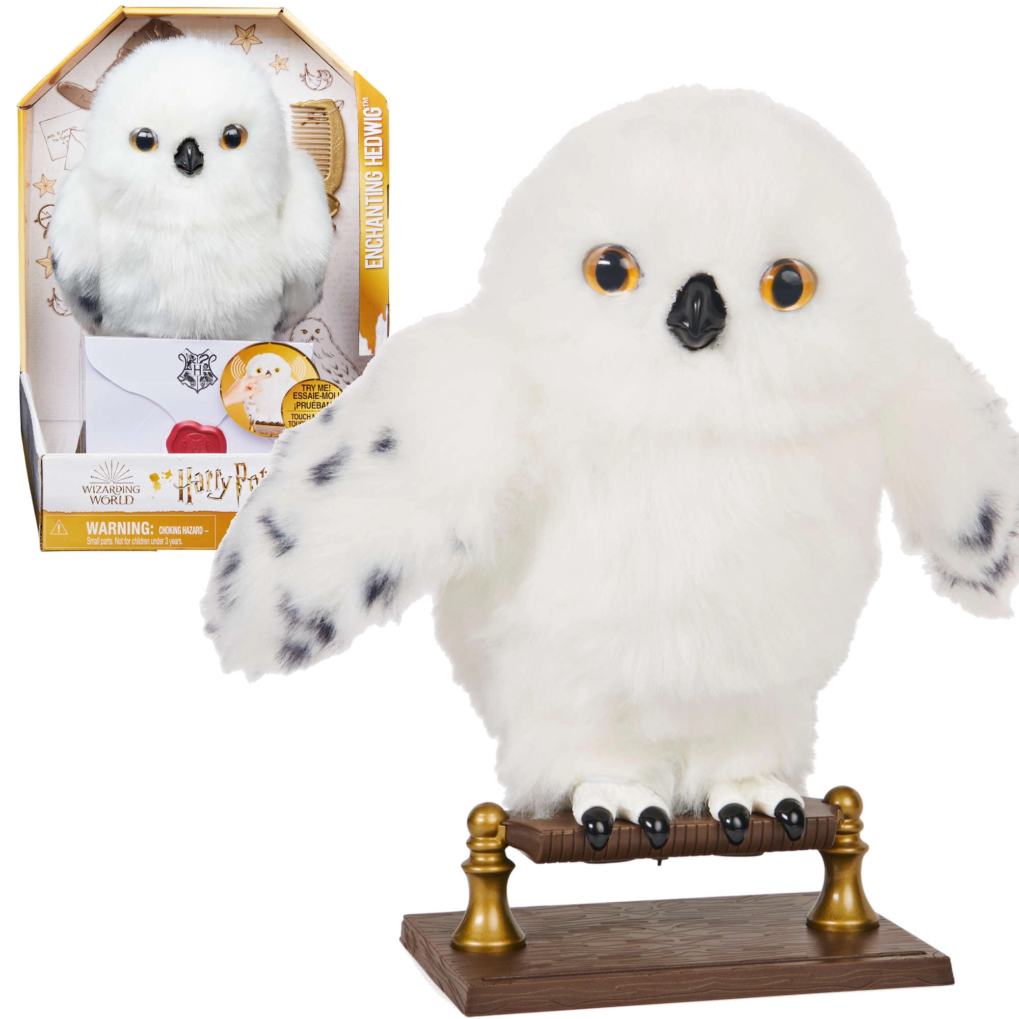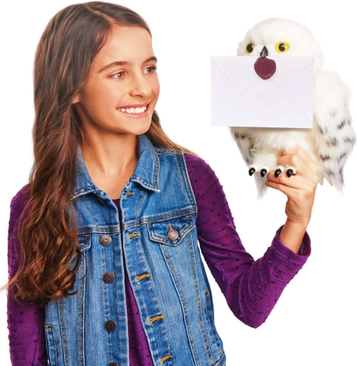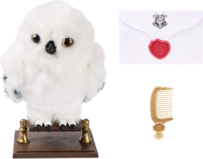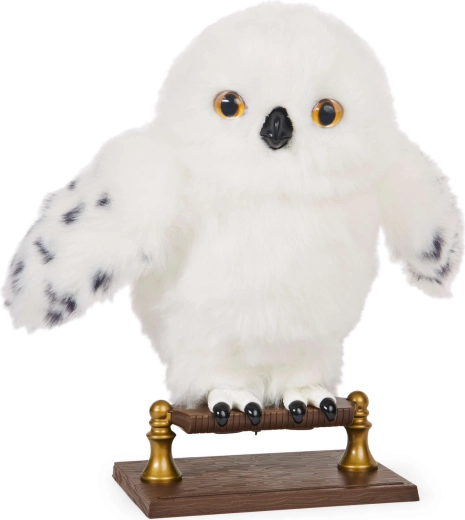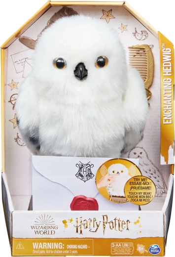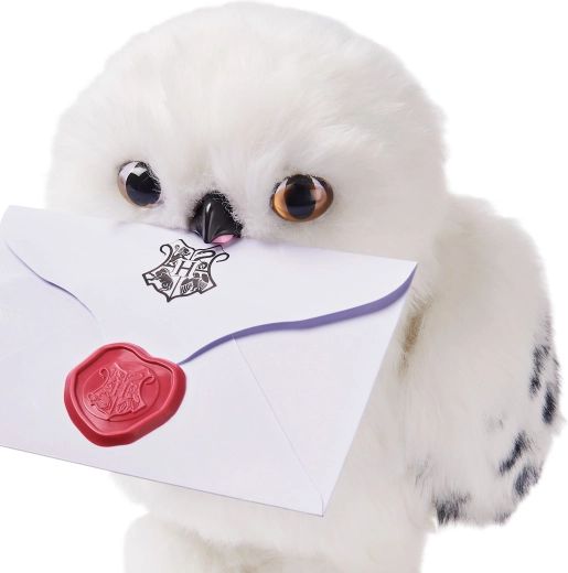 Otkrijte vjernu plišanu sovu koja oživljava na dodir. Hedviga ima mekano bijelo „perje“ s nježnim točkicama na krilima, realistične oči i otvarajući kljun koji pokreće čarobne zvučne efekte i pokrete. Savršena za maženje, izlaganje i maštovitu poštu iz Hogwarts.