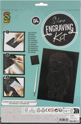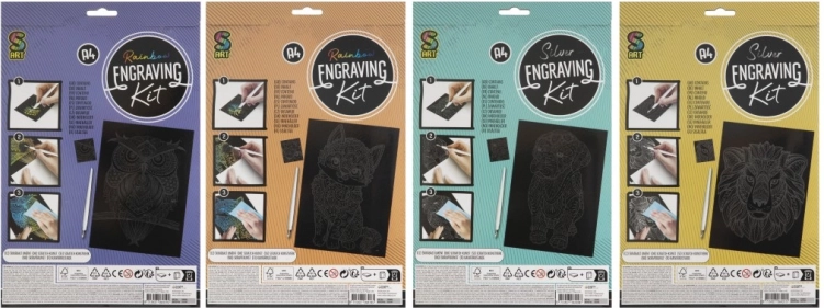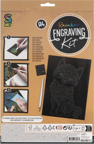 - U pakiranju: crtež s duginim slojem (25 × 20 cm), plastična strugalica s metalnim vrhom (cca 14,5 cm), probni crtež (7 × 6 cm)