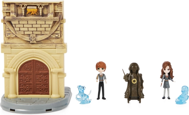 - Igraći set s vratima i kaminom, 2 figurice (Hermiona Granger, Ron Weasley), 2 figurice Patrona (vidra, terijer), trening lutka, dekorativne naljepnice
