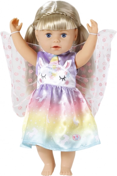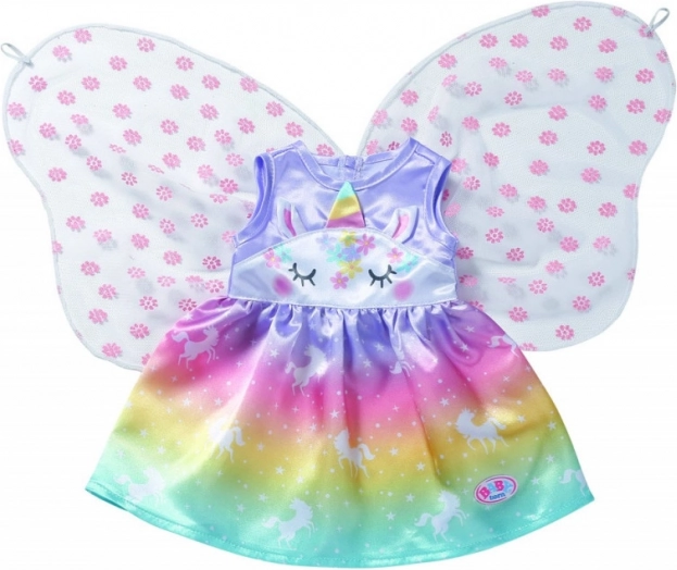 Vile i jednorogovi pripadaju jedno uz drugo kao mlijeko i keksi. Vilinska haljinica za lutku BABY born sašivena je od prekrasne tkanine u duginim bojama. Suknjica je otisnuta čarobnim jednorozima koji plešu zvjezdanim nebom. Gornji dio haljinice sprijeda je ukrašen licem jednoroga s našivenim uškama i šarenim rogom. Prava vila, naravno, mora imati i krilca. Prozirna krilca sa svjetlucavim cvjetićima ušivena su u stražnji dio haljinice, a čim BABY born provuče ruku kroz malu petlju u gornjem dijelu krilaca, ona se otvaraju. Originalna odjeća za lutke BABY born. Za maštovitu, raznoliku i dugotrajnu igru. BABY born Bajkoviti kostim Jednorog za lutke veličine 43 cm. U kompletu je i vješalica.