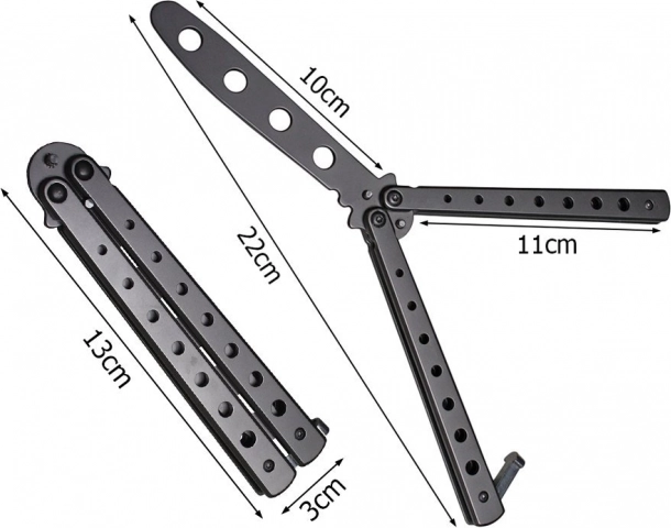 Otkrijte zabavan i siguran način treniranja balisong trikova. Ovaj leptir nož ima zatupjenu oštricu i čvrstu konstrukciju od nehrđajućeg čelika, pa je prikladan za svakodnevni trening bez rizika od posjekotina. Otvara se i zatvara glatko jednostavnim pokretom zapešća.