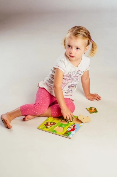 Drvena umetnička Farma je savršeno sredstvo za razvoj kreativnosti i pažnje vaše djece. Zahvaljujući bogato obojenim životinjskim motivima, privlači pozornost male djece i potiče ih da istražuju svijet farmarskih životinja. Igračka dodatno podržava kognitivni razvoj i koordinaciju ruke i oka.