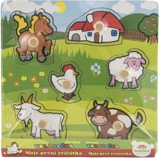 Ova umetnička sadrži ukupno 5 obojenih životinja uključujući konja, kozu, ovcu, kokoš i kravu, koje se lako mogu uhvatiti zahvaljujući malim drvenim ručkama. Svaki dio ima svoje mjesto na drvenoj podlozi, što također pomaže djeci da nauče ispravno postaviti svaki dio.