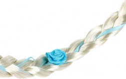 Elegantna plavokosa pletenica isprepletena svijetloplavom vrpcom i cvjetićima daje kostimu nježnost i bajkovni štih.