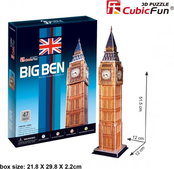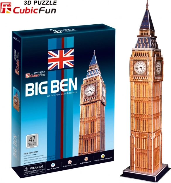 Otkrijte zabavnu i kreativnu gradnju s 3D puzzle CUBICFUN Big Ben. Model od čvrste pjenaste ploče s laminiranim tiskom sastavit ćete bez ljepila i škara – idealna obiteljska aktivnost i stilska dekoracija. Realistično izvedenje, jednostavno vađenje predrezanih dijelova i zahtjevnost 4/5 razveselit će sve ljubitelje arhitekture.