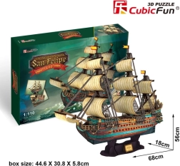 3D puzzle jedrenjaka San Felipe brenda CubicFun donosi realističan model povijesne galije s bogatom dekoracijom i promišljenim detaljima palube. Dijelovi od oko 3 mm pjene presvučene laminiranim tiskanim papirom precizno se uklapaju i omogućuju stabilan i atraktivan rezultat bez upotrebe ljepila ili škara.