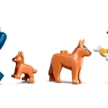 Dvije minifigure policajaca, figurica psa i šteneta, plus četka, baterijska lampa, lopata i poslastice – sve za živopisne role-play scene vodiča pasa.