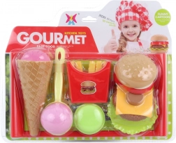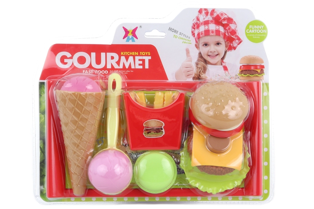 Ovaj šareni set hrane izvrstan je dodatak dječjoj kuhinjici. Djeca mogu pripremiti burger po svom ukusu, grabiti sladoled žlicom i poslužiti sve na priloženom poslužavniku. Realistični detalji potiču oponašanje pravog kuhanja i posluživanja.
