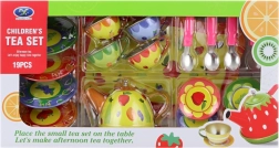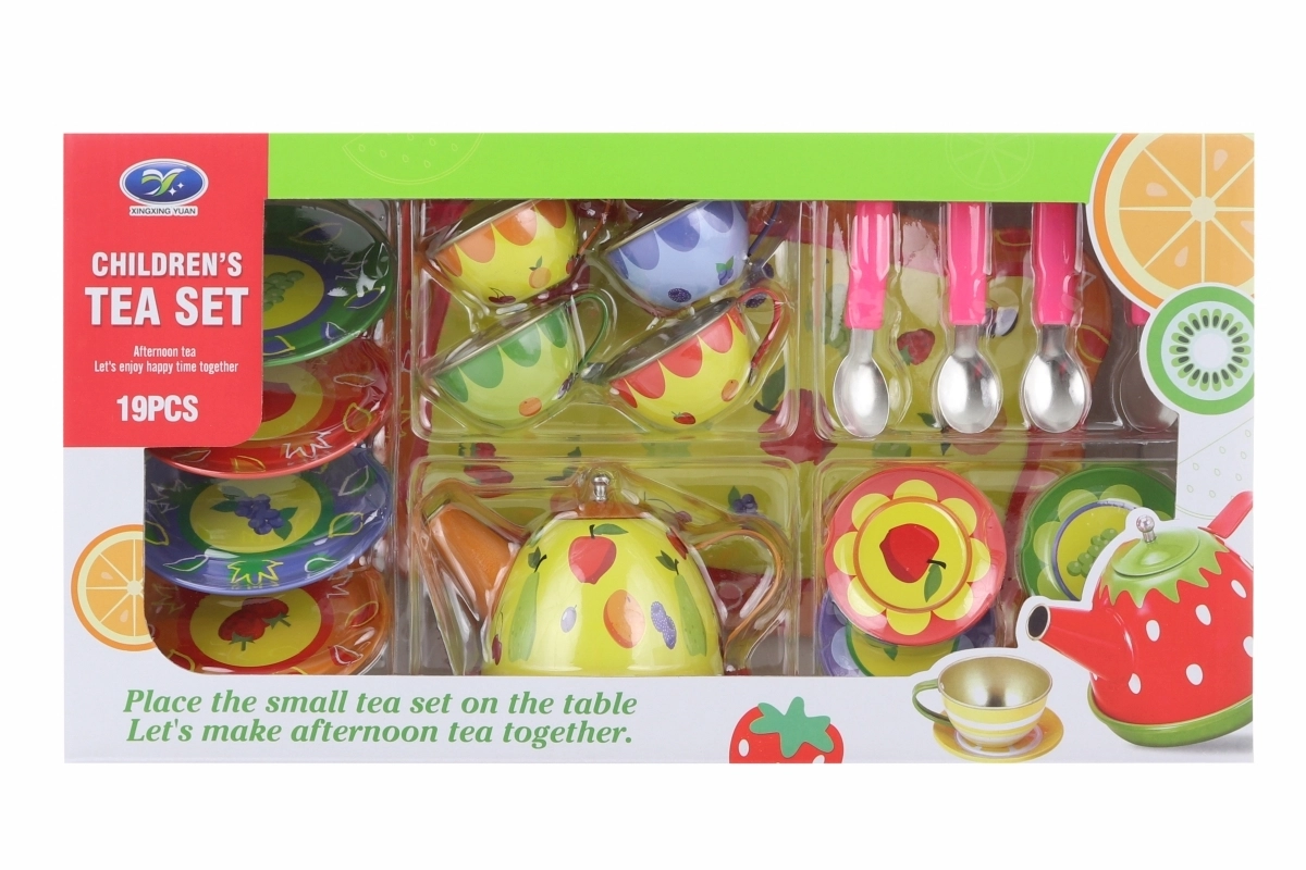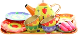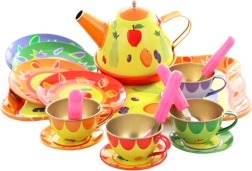 Uljepšajte dječje poslijepodne ovim šarenim limenim čajnim setom za male domaćine. Set sadrži čajnik, pladanj, šalice, tanjuriće, tanjure i žličice – sve s veselim voćnim i cvjetnim motivima. Izdržljivo limeno izvedenje idealno je za igru čajanke, potiče maštu, igru uloga i društvenu interakciju. Prikladno za djecu od 3 godine.