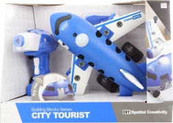 Avion u plavo-bijeloj kombinaciji izrađen je od izdržljive plastike i ima realistične detalje poput prozora, podvozja i krila. Pakiranje sadrži odvijač i dječju bušilicu, koja služi i za montažu i kao pogonski modul. Sastavljen model ima dimenzije približno 26 × 25 × 14 cm i taman je za dječje ruke.