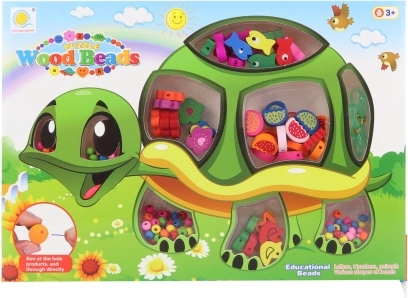 Kreativni set drvenih perlica s motivom kornjače za djecu od 3 godine razvija finu motoriku i maštu. Sadrži mnogo šarenih oblika i uzice za nizanje u praktičnom pakiranju cca 28 × 19,5 × 2,5 cm.