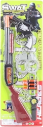 Set oružja za djecu sadrži pušku, revolver, lisice, sat i tri metka s prianjajućom kapicom, idealno za igru i razvoj dječje mašte.