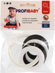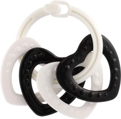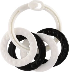 Ovaj set prstenova u crno-bijeloj izvedbi osmišljen je za najmlađe bebe. Kontrastne boje privlače pažnju, pomažu u vježbanju koncentracije i podupiru zdrav razvoj vida. Zahvaljujući različitim oblicima i teksturama dijete vježba finu motoriku i koordinaciju oko–ruka.