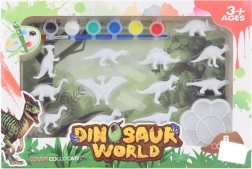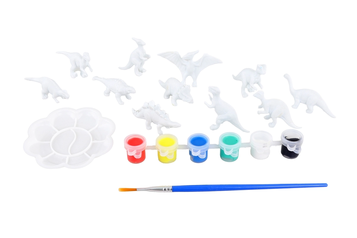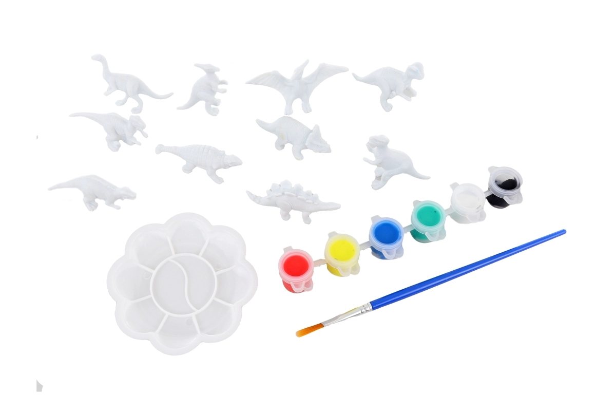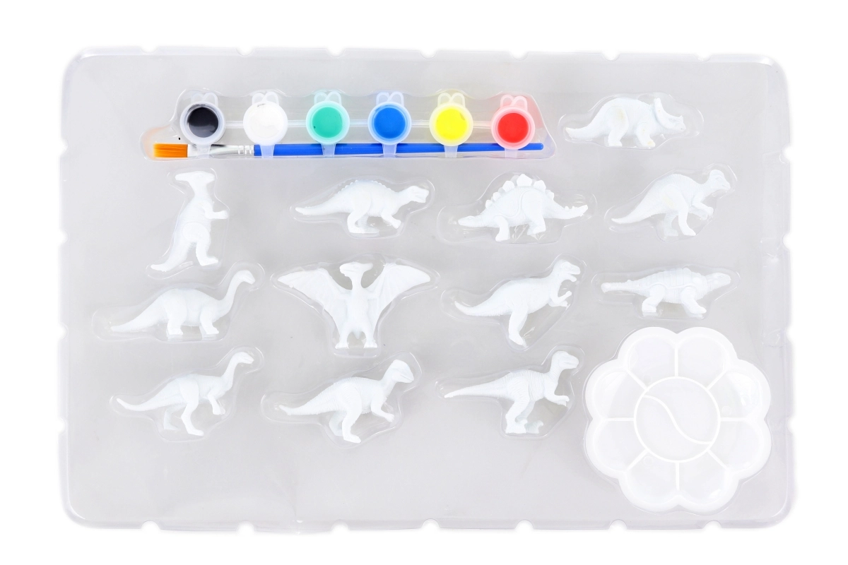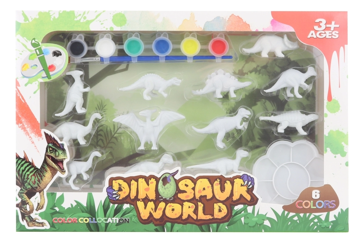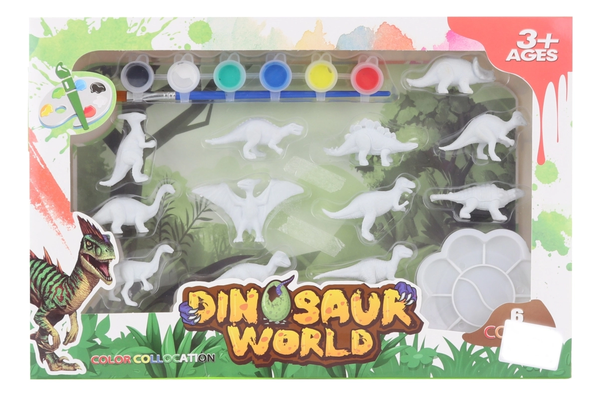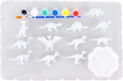 Set sadrži 3D dinosaure, 6 boja, kist i paletu – djeca mogu odmah započeti s kreativnim radom bez dodatne kupnje pribora.